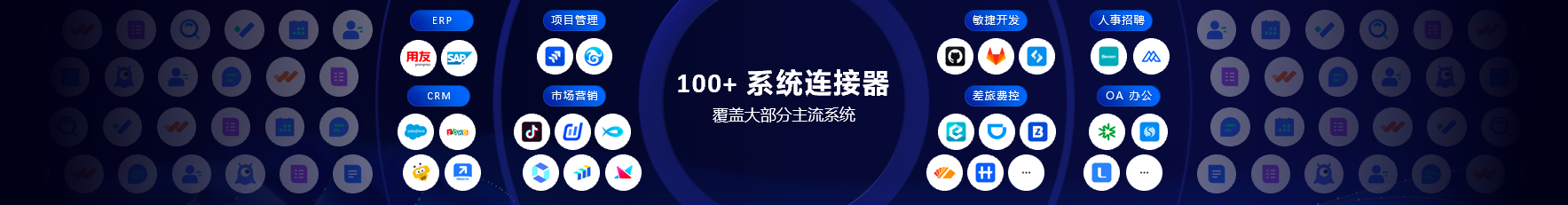 - 覆盖系统广:已经有100多个系统连接器,支持了市场上大部分的主流系统,比如用友、金蝶、SAP、Salesforce、Jira、MySQL等。