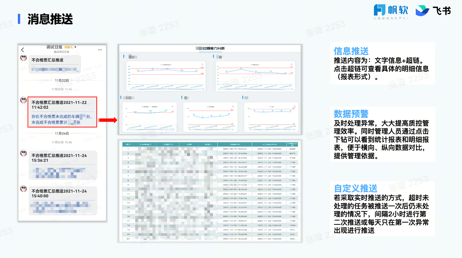 - 数据出现异常波动时,通过飞书机器人,实现“数据找人”,及时向负责对象推送报警信息。