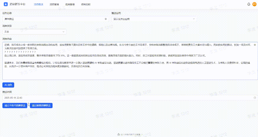 AI 消息群发助手可用于企业内部各类通知的精准推送,如节假日安排、政策更新、活动宣传等,确保信息及时、准确地传达给目标员工。