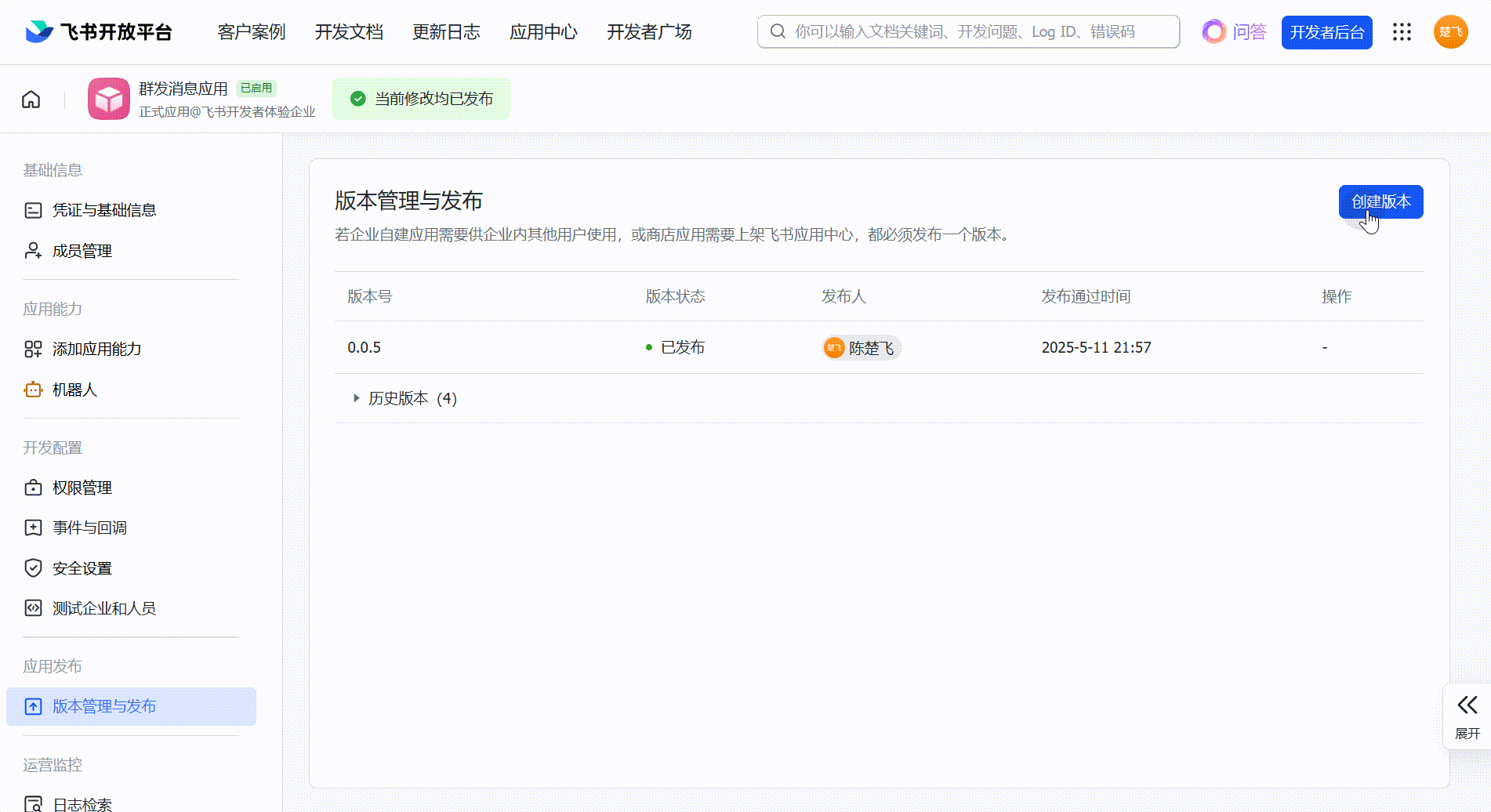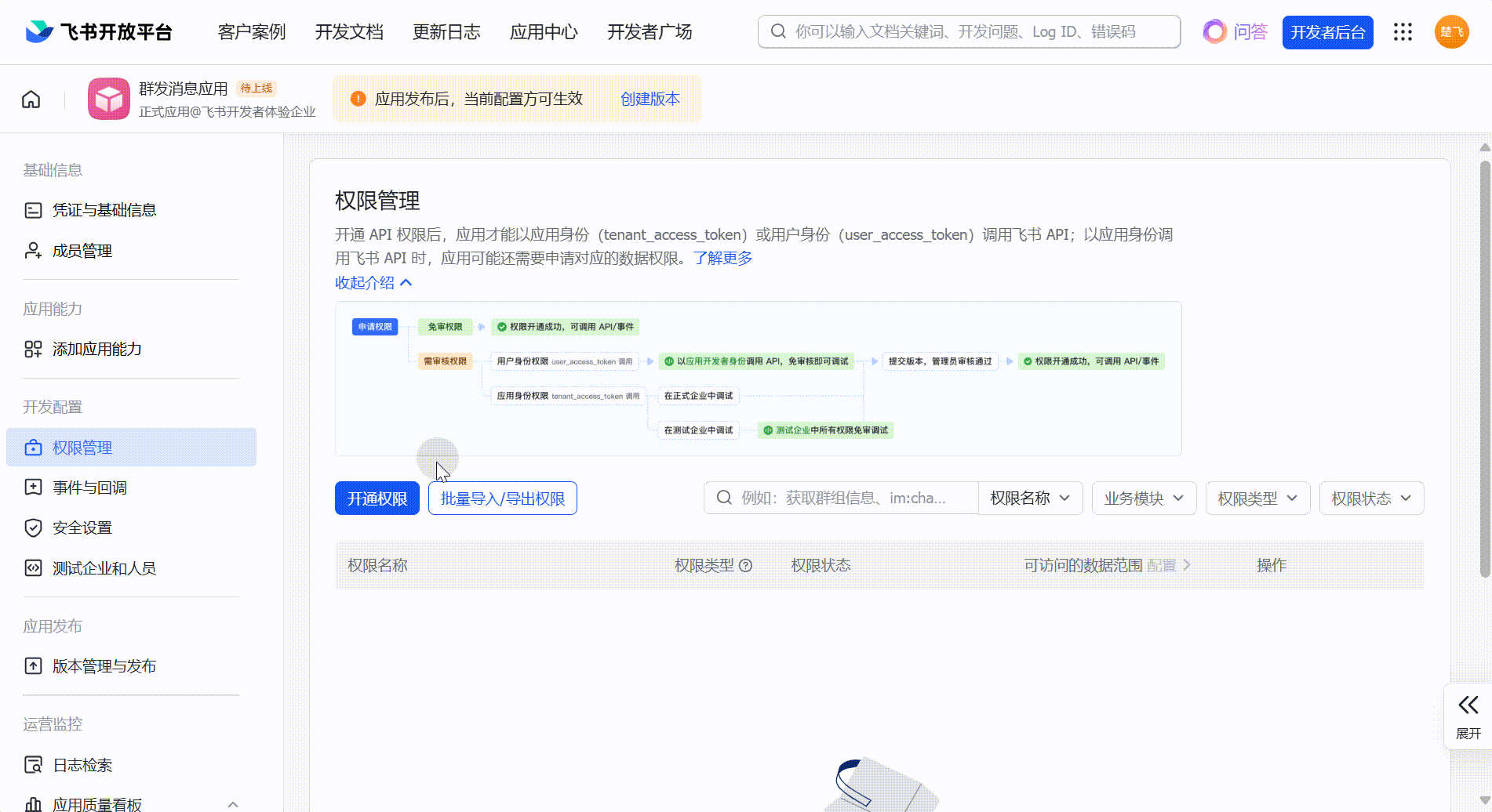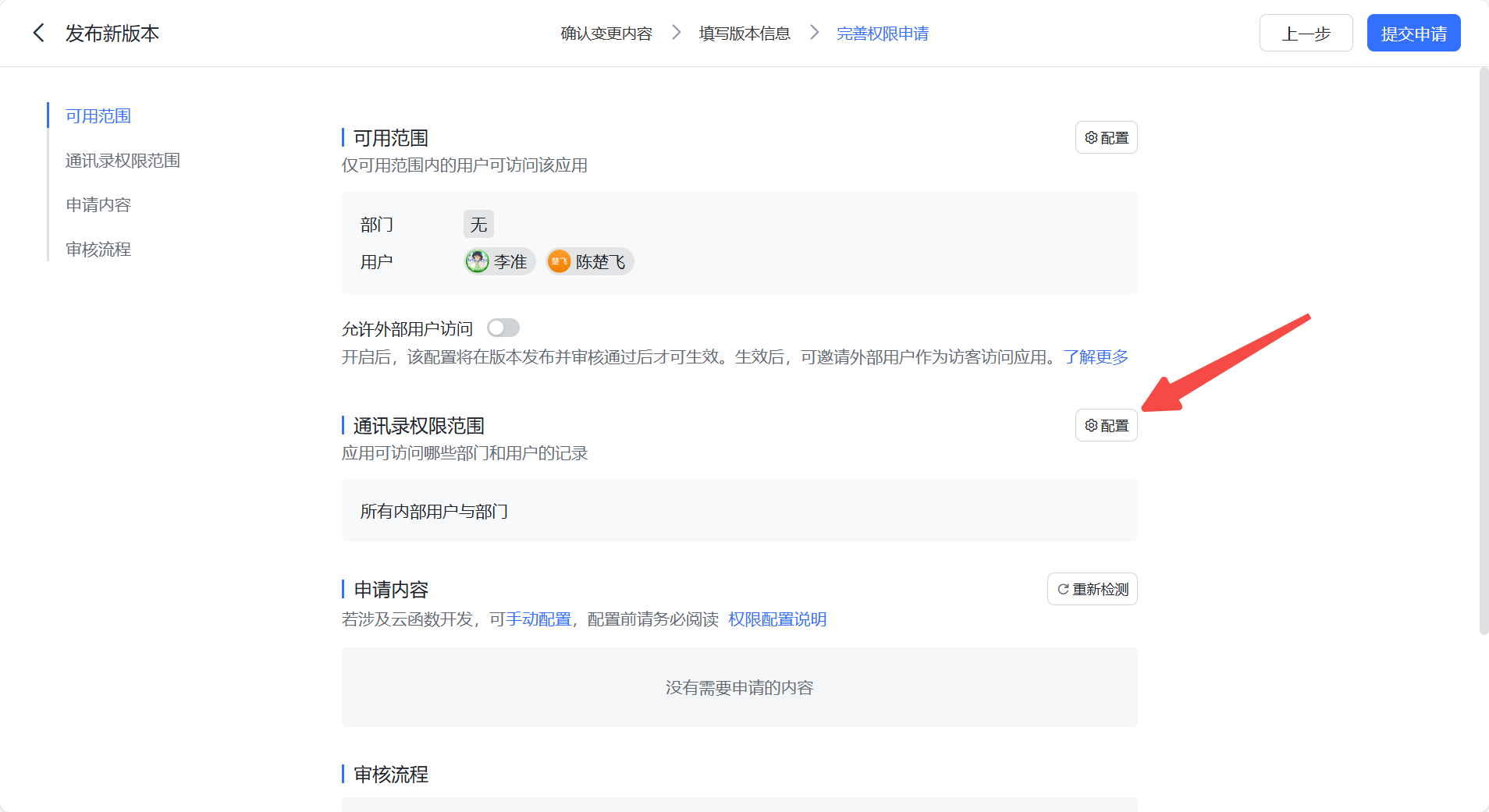 - 本次发布会自动为本应用申请所需的一系列通讯录权限,所以发布一般需要平台管理员与飞书管理员进行审核