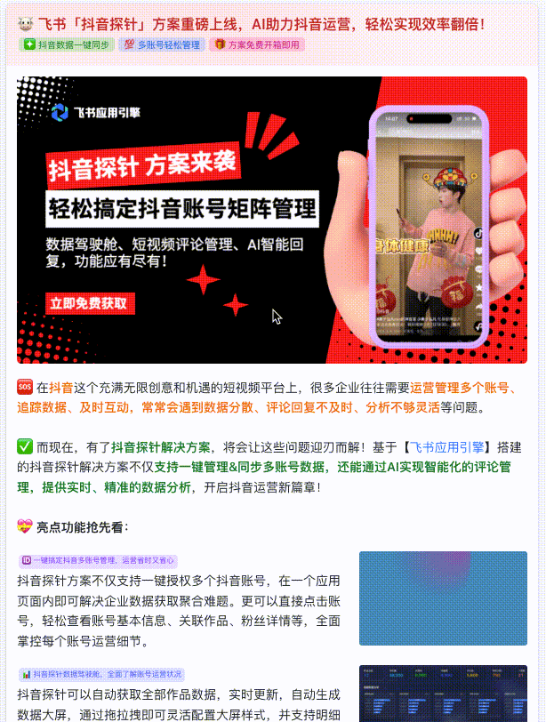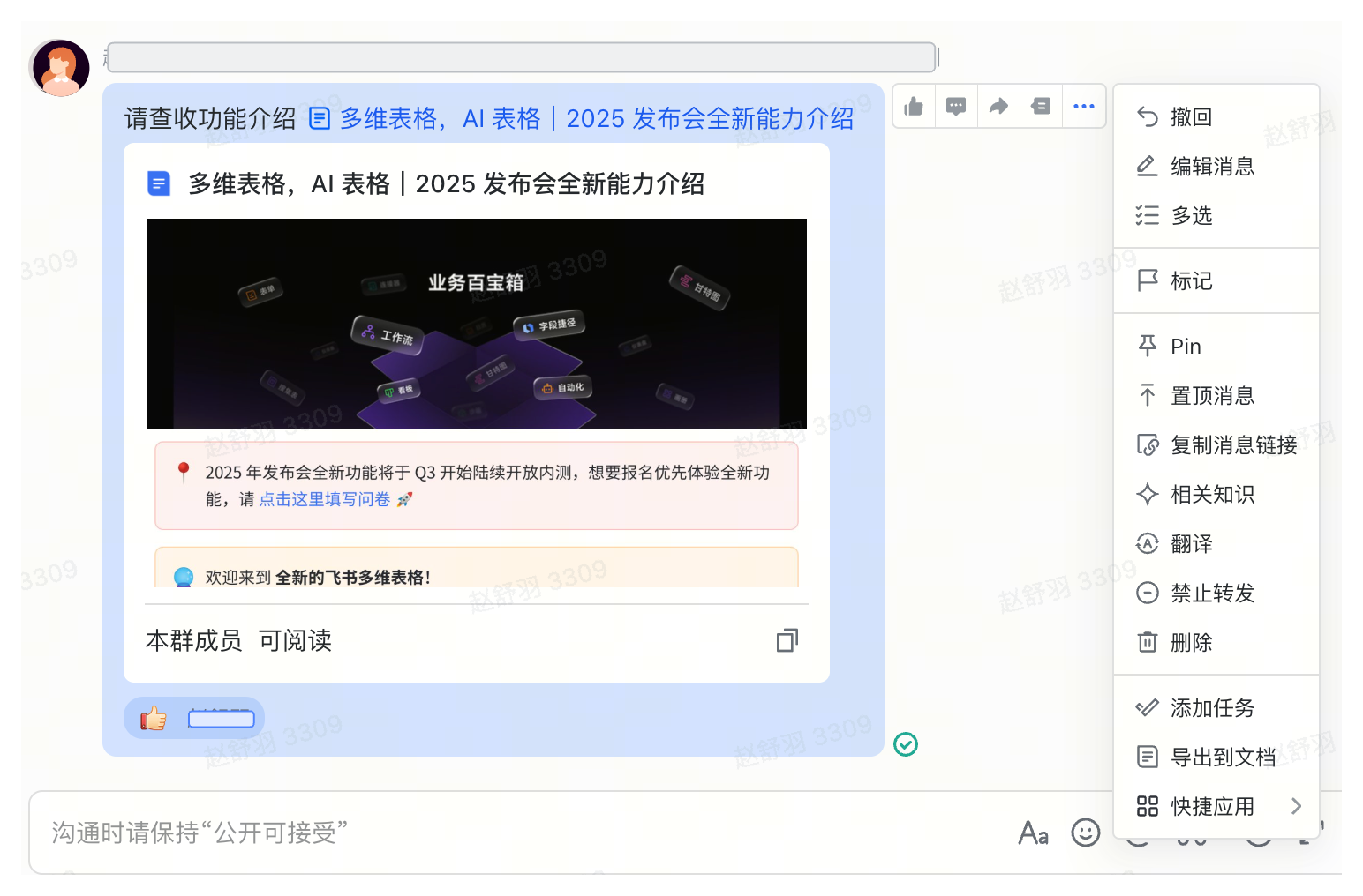 支持批量发送群消息、AI智能润色、定时发送与查看读取情况、消息撤回、定制化形式(不仅仅是发文字,还能自动带上文档链接、多维表格甚至是动态图片)