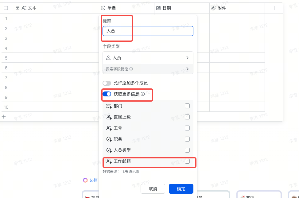 A:你可以通过飞书管理后台导出指定部门的成员信息来获取,也可以通过多维表格选择人员字段后,将需要发送的人员录入到多维表格中,选择获取更多信息,勾选工作邮箱来获取。