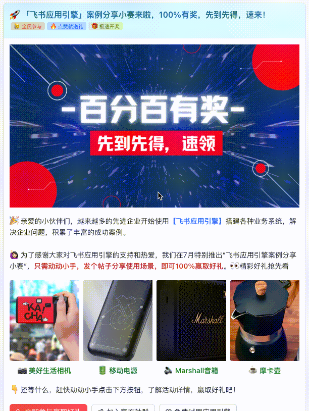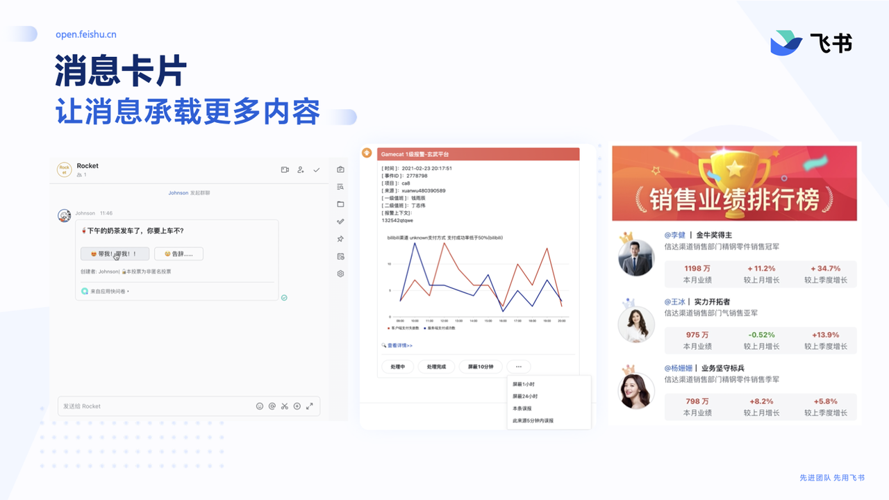 大家在飞书中经常可以收到一些带有 图片、文字、按钮等多种元素的消息,这就是飞书消息卡片。它是飞书中的一种功能,允许用户通过机器人或应用,以结构化的方式发送和接收消息。