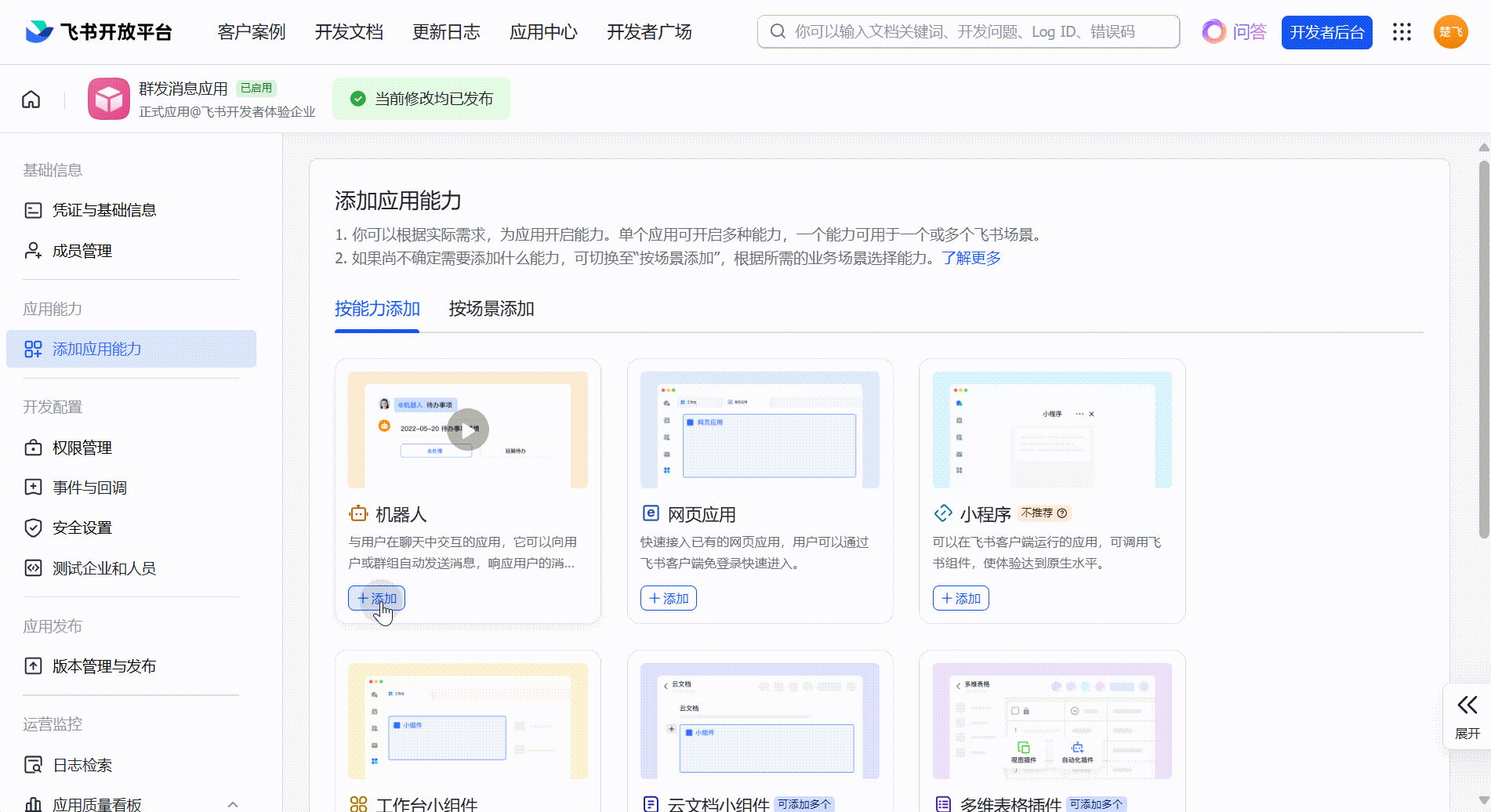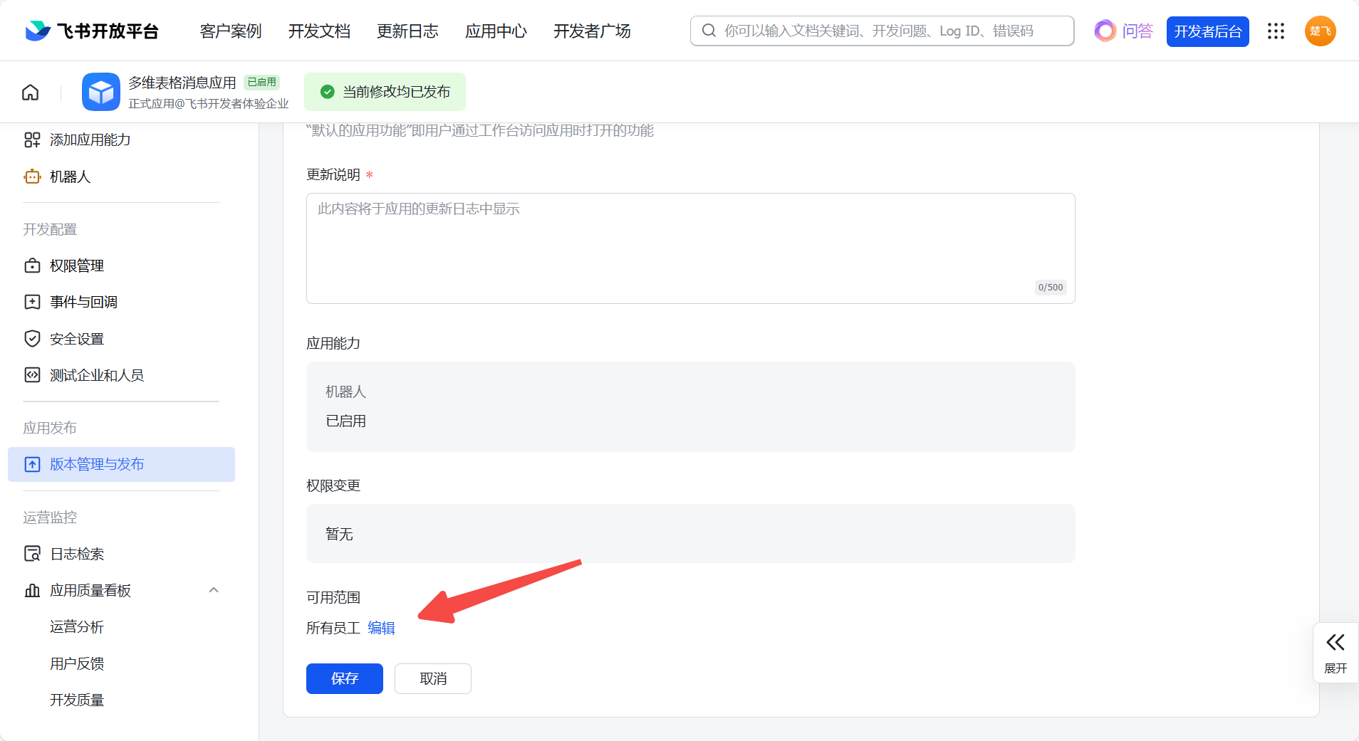 - 发布应用,这里需要设置应用可用范围,即你想给哪些人发消息,就需要把这些人放在应用仅能的可用范围内,如果你想给全员发消息,这里可用范围则需要设置为全员。配置完成后点击发布,通过审核发布成功后,即创建成功。此时,你可以将应用的app id 和 app secret 复制到AI消息群发助手中,即可使用消息群发助手进行群发。