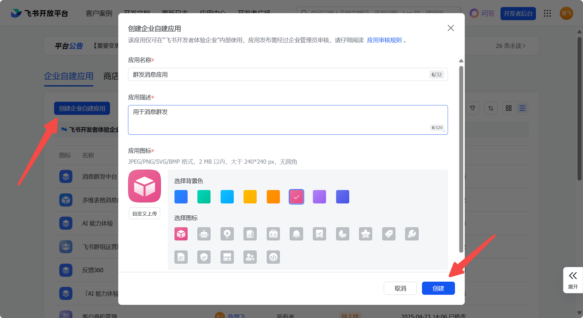 - 首先需要前往 飞书开放平台-开发者后台 中创建一个自建应用,这个应用的名称可以自定义、图标可以自定义。