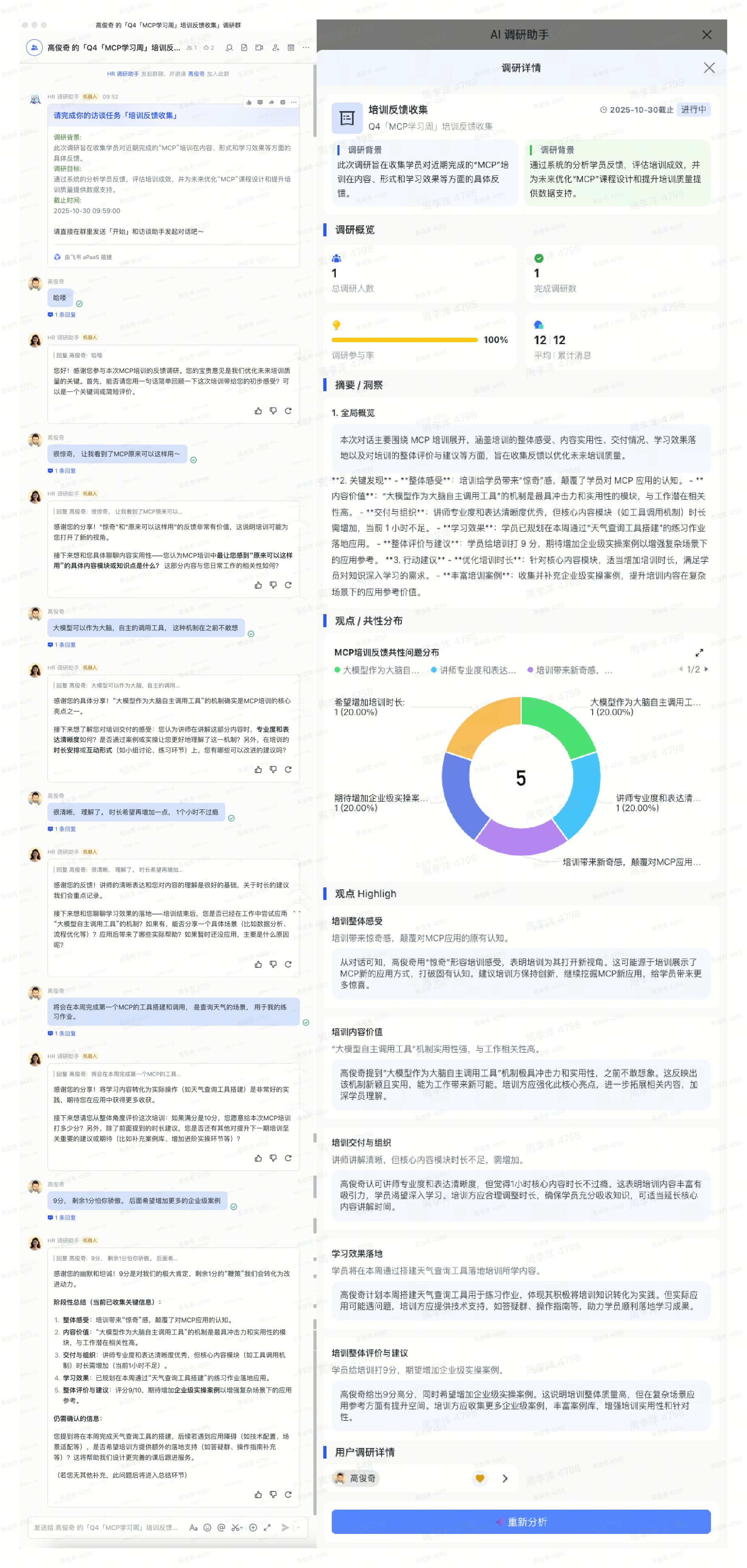 使用 AI 智能调研后,AI 培训反馈场景自动在群内提问,深度挖掘培训效果、情绪反馈。平台自动整理所有观点,形成可执行的改进报告。