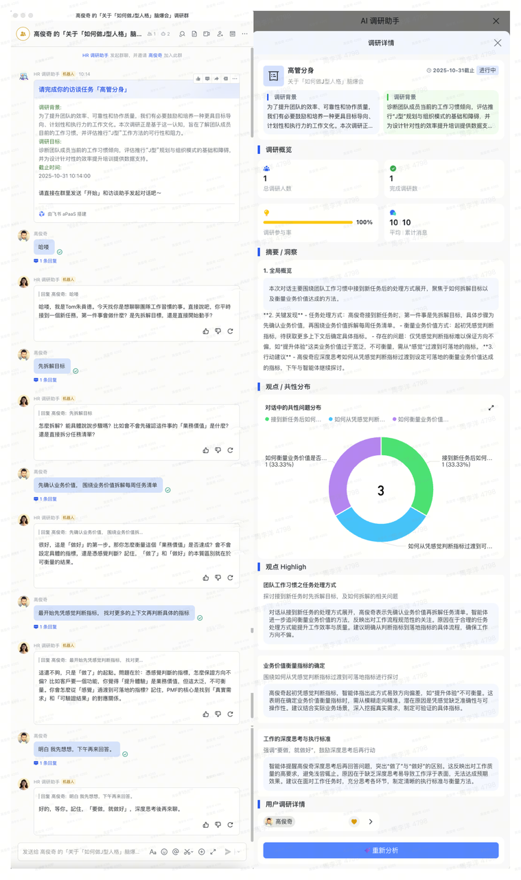 与传统的 AI 访谈助手不同,AI 智能调研的总结介质是群聊智能体对话记录,主要目的是获取反馈/想法等信息并进行内容洞察和消化,主要服务于业务职能。