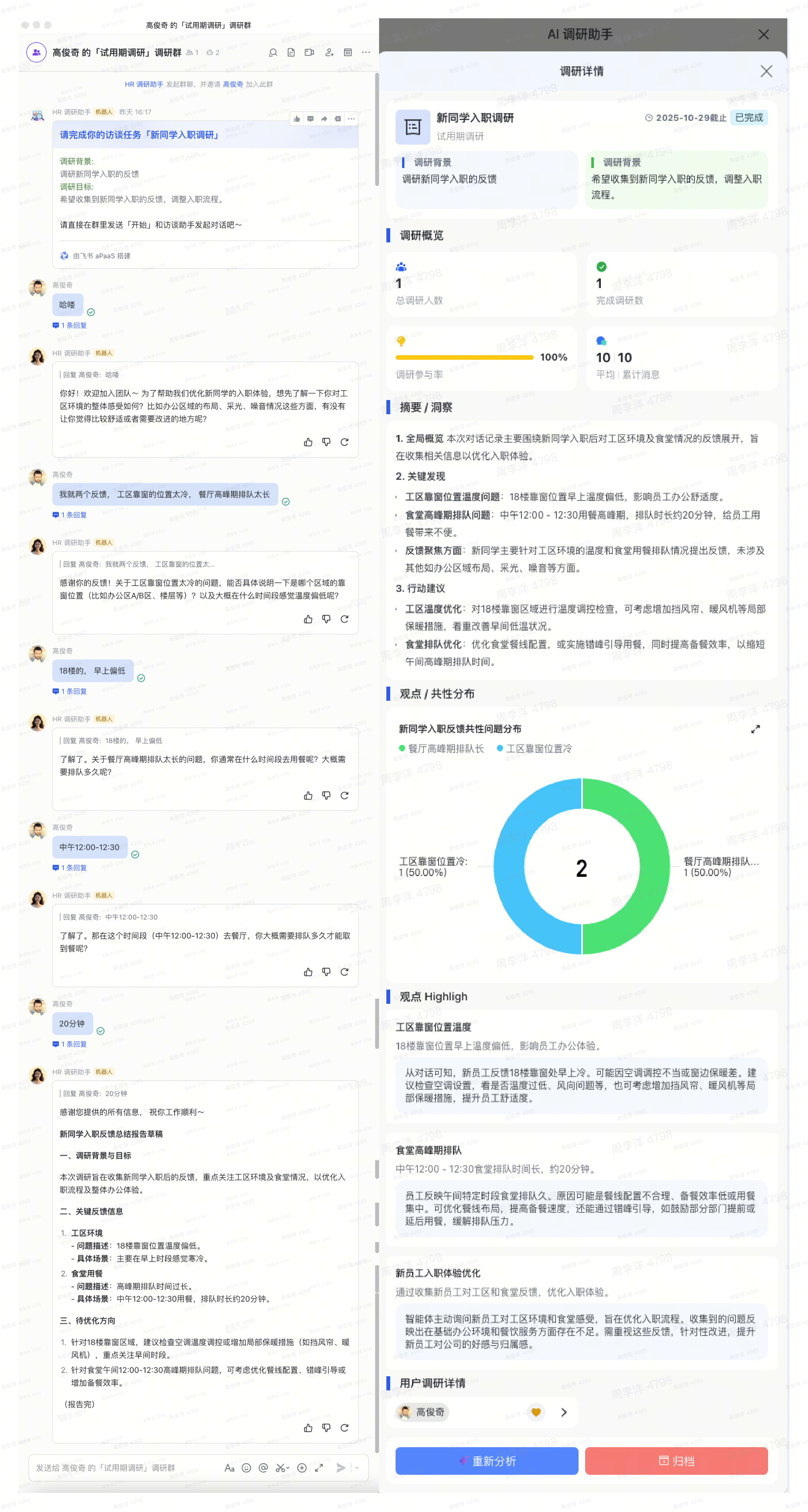 使用 AI 智能调研后,只需圈选 10 个用户,AI 访谈场景自动在群里提问和深挖。聊天结束后,系统即刻生成结构化观点和洞察报告。