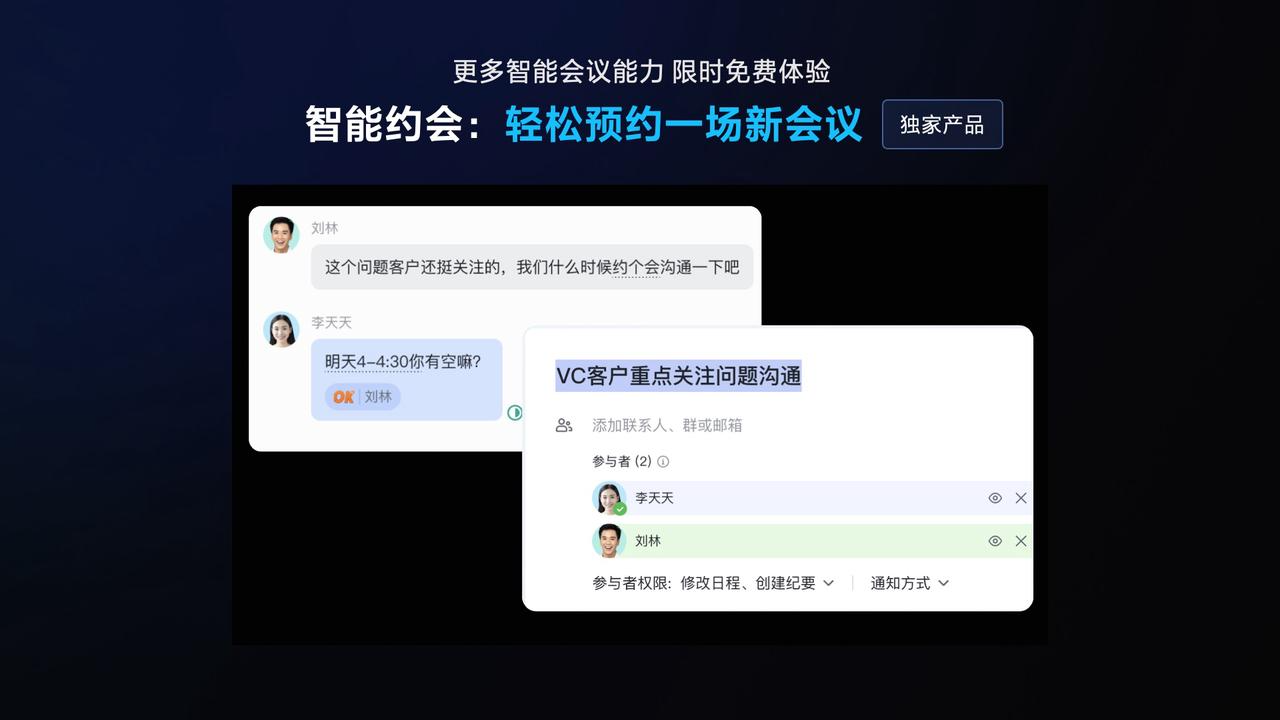例如,当用户在聊天中提到“明天 4-4:30 有空”时,系统会弹出日程创建窗口,自动填充标题“VC 客户重点关注问题沟通”和时间,并支持添加联系人、群或邮箱,设置参与者权限等