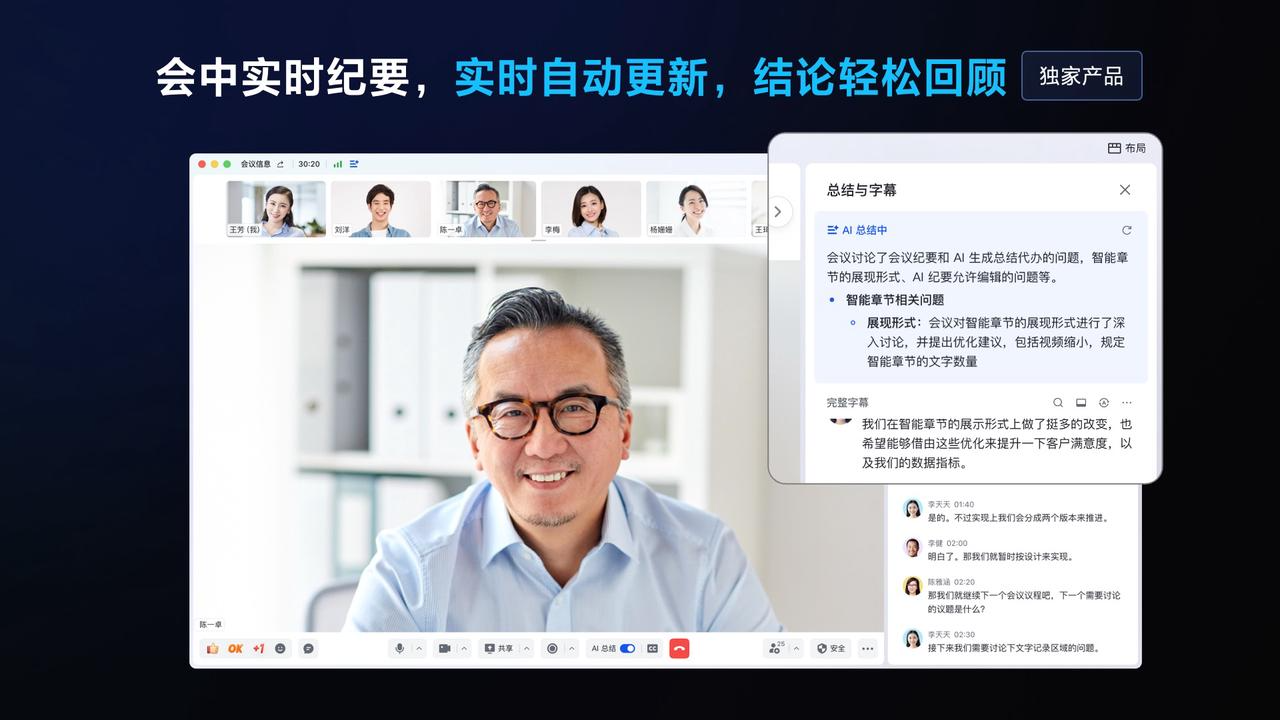 - 会议进行中,智能会议纪要可实时自动总结会议要点,方便参会人实时回顾会议进展;即使错过部分会议内容,也能快速跟上会议进度。总结内容会以窗口形式弹出,显示会议讨论的核心议题及结论,如“专属模式”“智能章节”等要点。