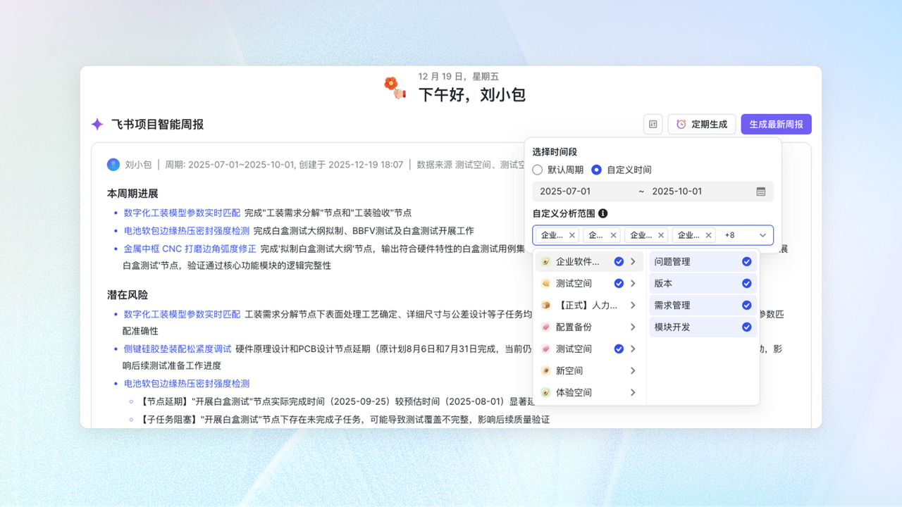 - 辅助周报撰写,一键生成初稿:你不再需要手动查找数据。在周会汇报前,只需设置分析时间段与范围,AI 即可智能连接飞书项目、文档及项目群聊信息。