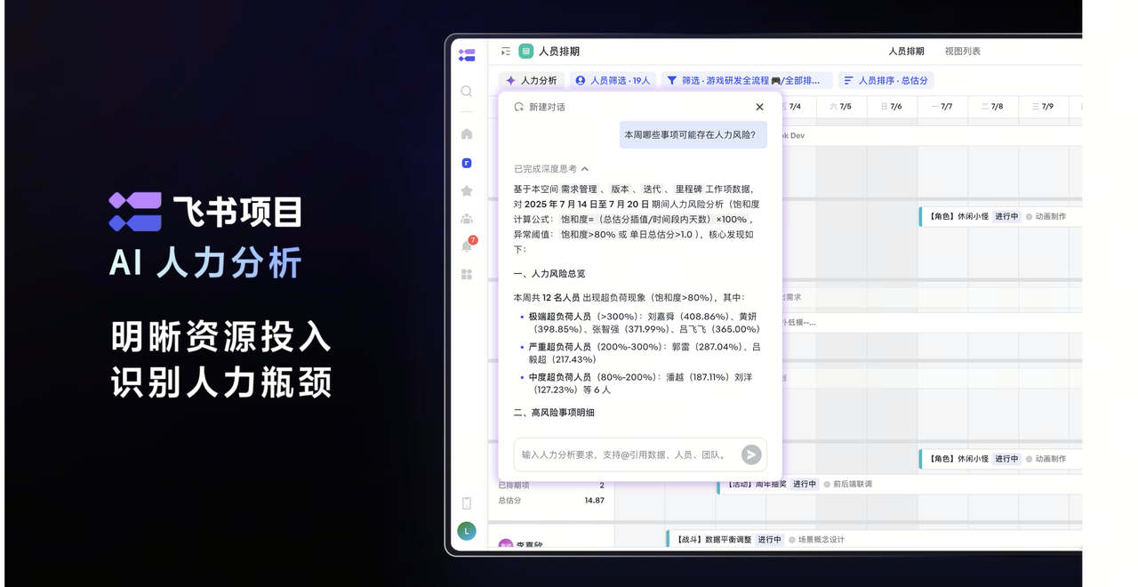 团队管理者可以通过与 AI 对话的方式,快捷获取团队在指定周期的人力投入数据,高效识别团队人力饱和度异常等常规项目管理工作