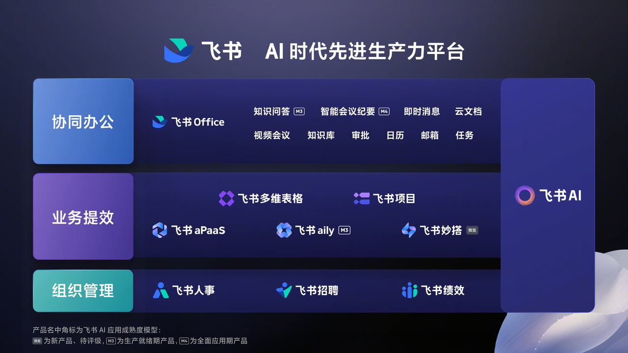 飞书功能模块围绕「协同办公」「业务提效」「组织管理」三大核心构建,整合即时消息、智能日历、音视频会议、云文档、云盘、邮箱等一站式办公工具,搭配飞书 OKR、招聘、绩效等组织管理功能,辅以多维表格、飞书项目、审批、自动化流程等业务提效工具,并深度融入知识问答、智能会议纪要、AI Agent等 AI 能力,实现从沟通协作到业务管理的全流程数字化闭环。