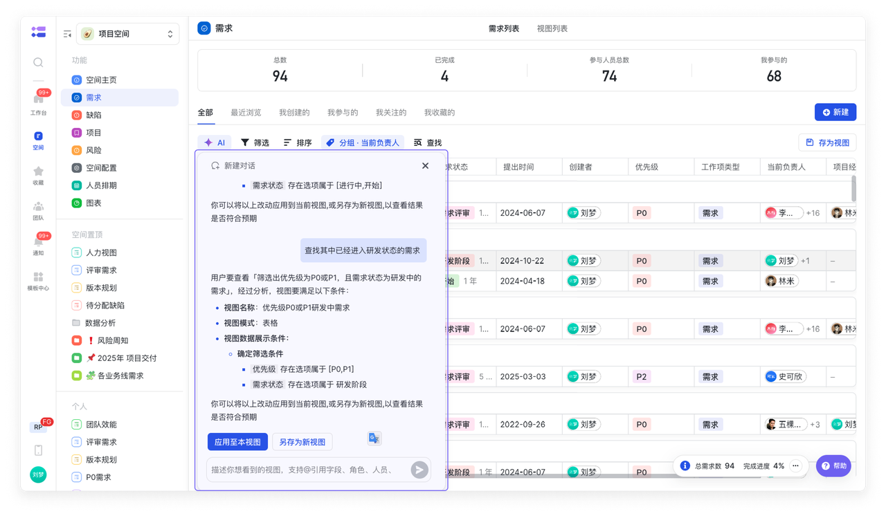 通过自然语言指令,智能生成所需视图,大幅提升项目管理效率。例如,在排期会上,您只需在对话框里输入:“帮我筛选出所有 P0 优先级的、且已延期的任务,按负责人分组”,AI 就能快速生成精准的视图。