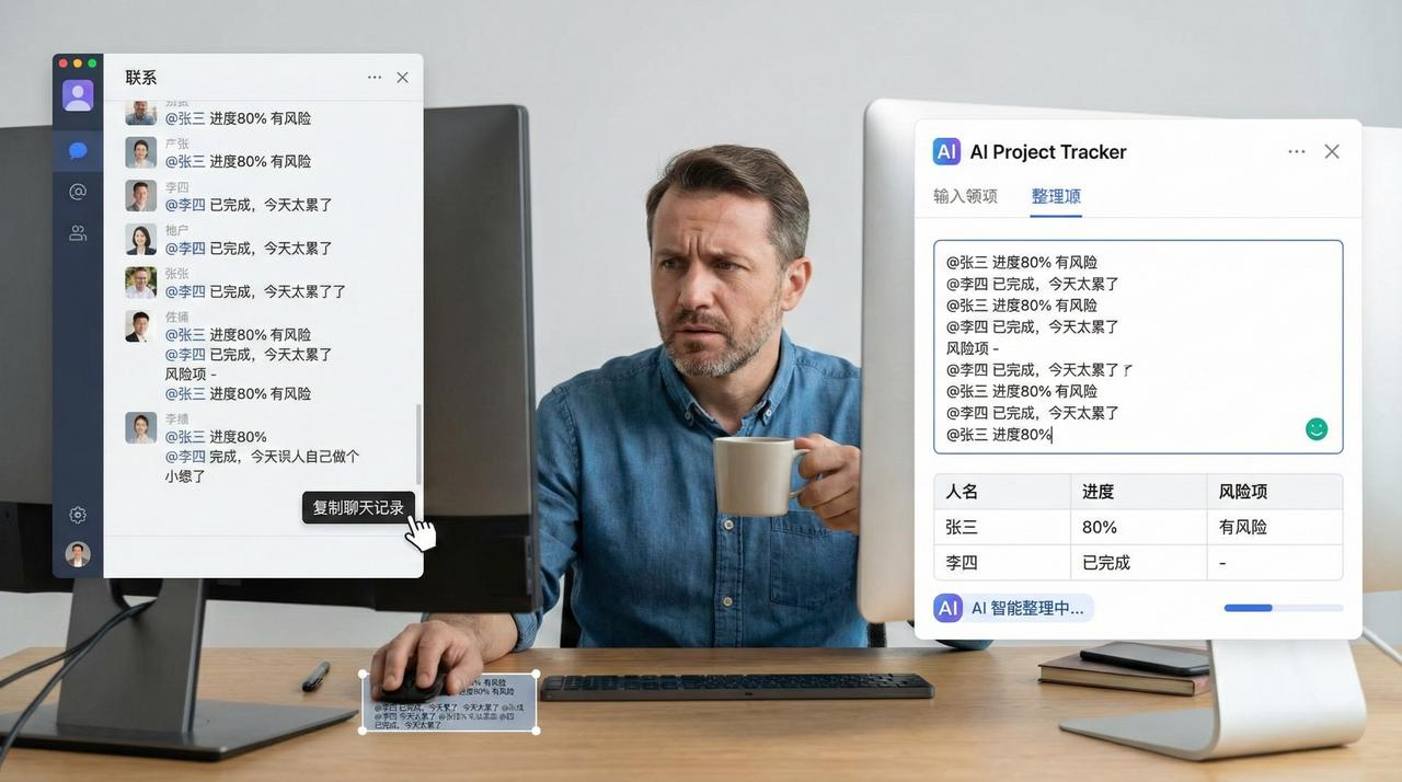 项目主管每天在微信群里收一堆乱七八糟的日报:“@张三 进度 80% 有风险,@李四 已完成”。想整理成表,得复制粘贴几十次,还得把废话删了。现在直接把群里的聊天记录粘贴进表,AI 自动把 “人名”、“进度”、“风险项” 抠出来,废话全扔掉。