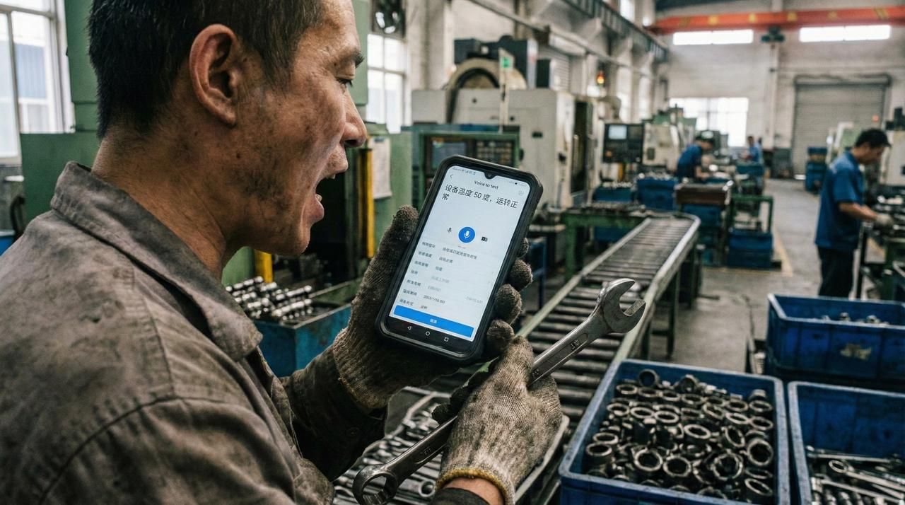 工人手里拿着工具或者戴着手套,根本无法通过打字反馈产线情况。这时候,只需要对着手机吼两句 “设备温度 50 度,运转正常”,表单自动就填好了。