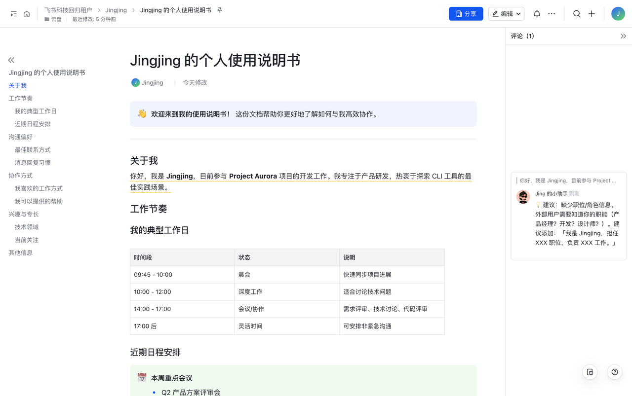 根据我的所在部门、飞书消息、飞书云文档、日程等信息,帮我创建一篇飞书云文档,写一篇个人使用说明书。