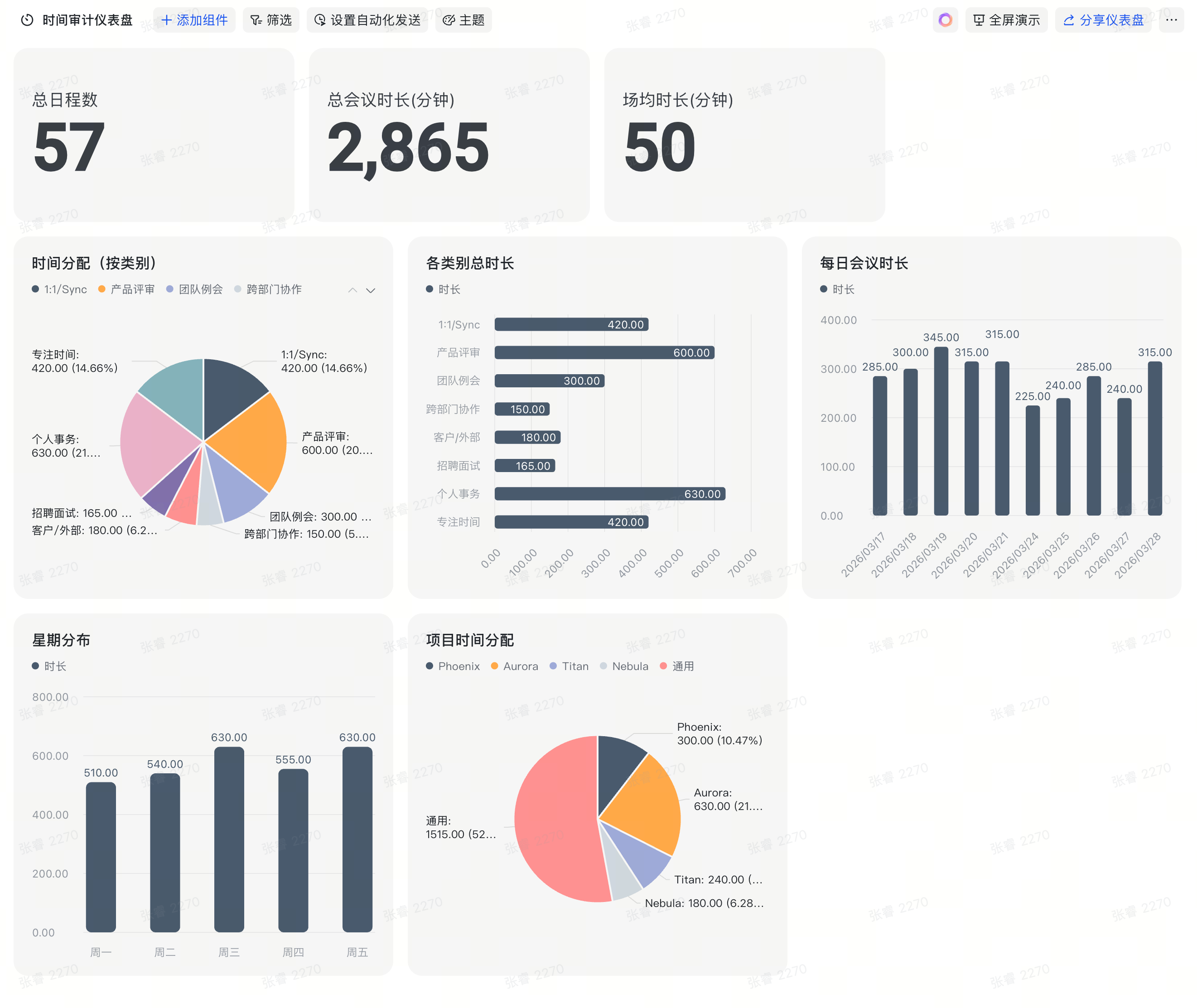 你知道自己每天在开会,但不知道时间到底花在了哪里。一句话,agent 拉取你过去两周的日历数据,自动给每场会议打标签(1:1/产品讨论/团队会/个人事务),写入多维表格,生成仪表盘。饼图看占比,柱状图看趋势。一张图告诉你该砍哪些会。