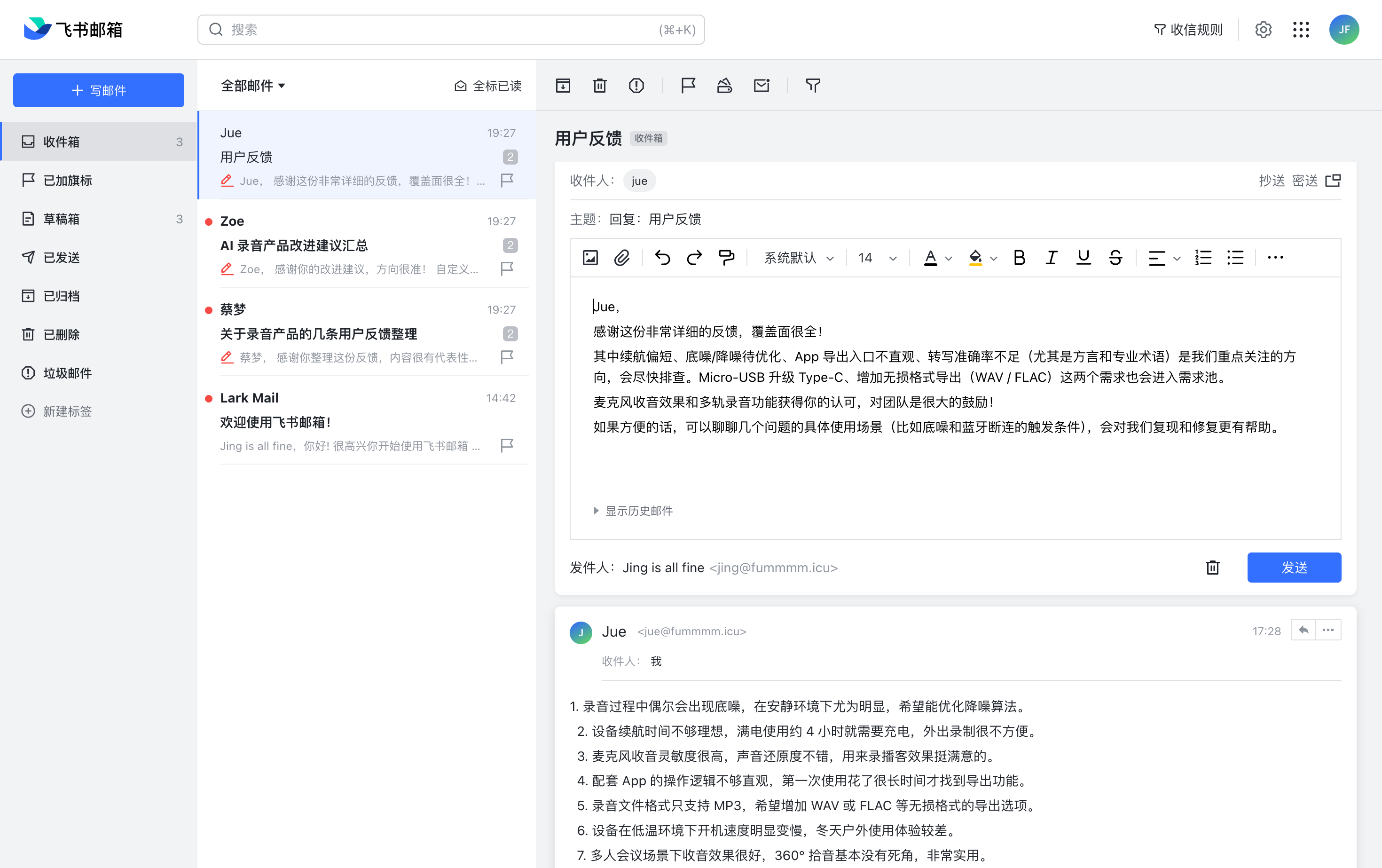 飞书 CLI 的邮箱能力做了重点增强,补齐了增删改查的完整能力,让飞书邮箱也能融入 AI 工作流。
