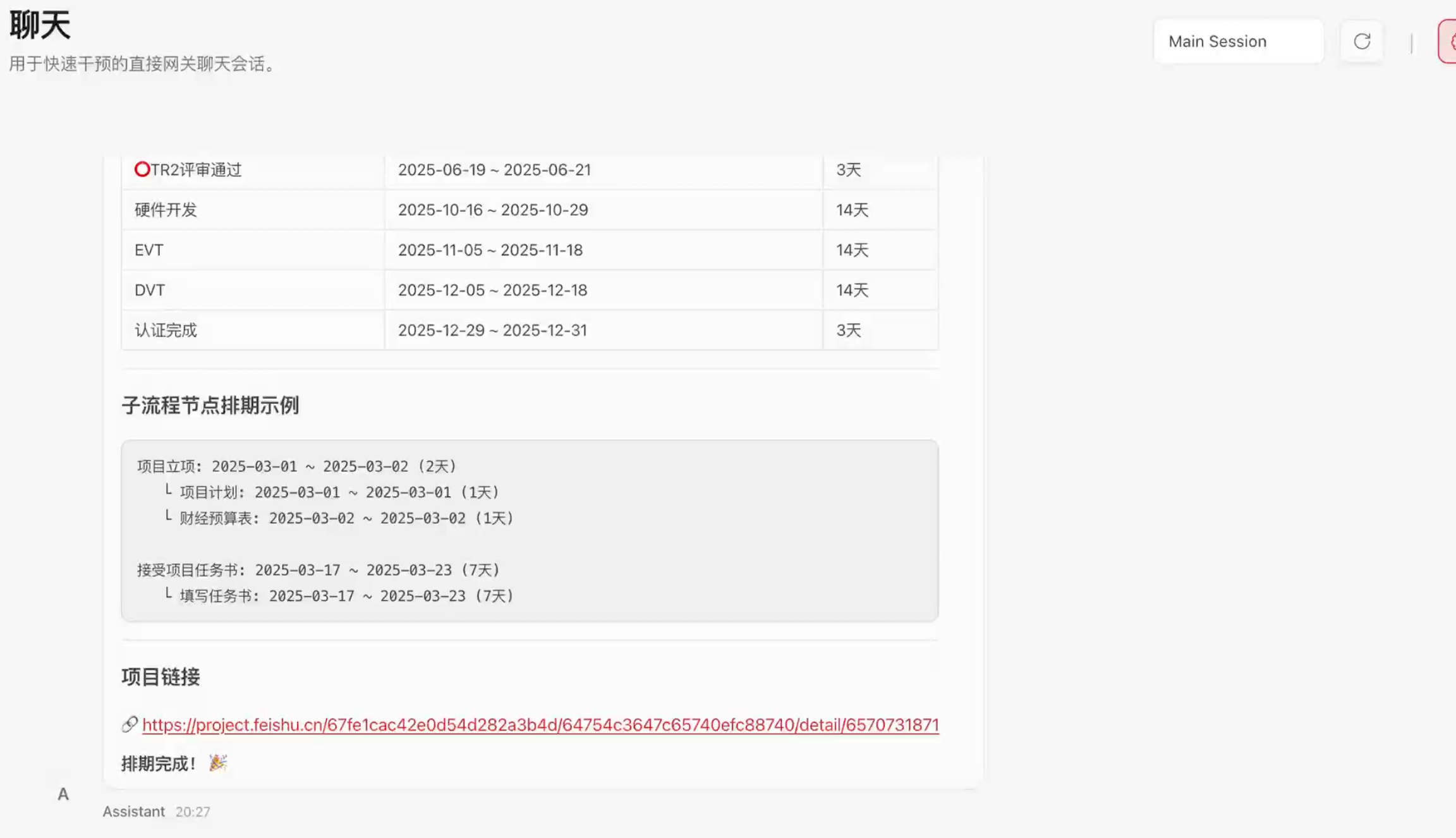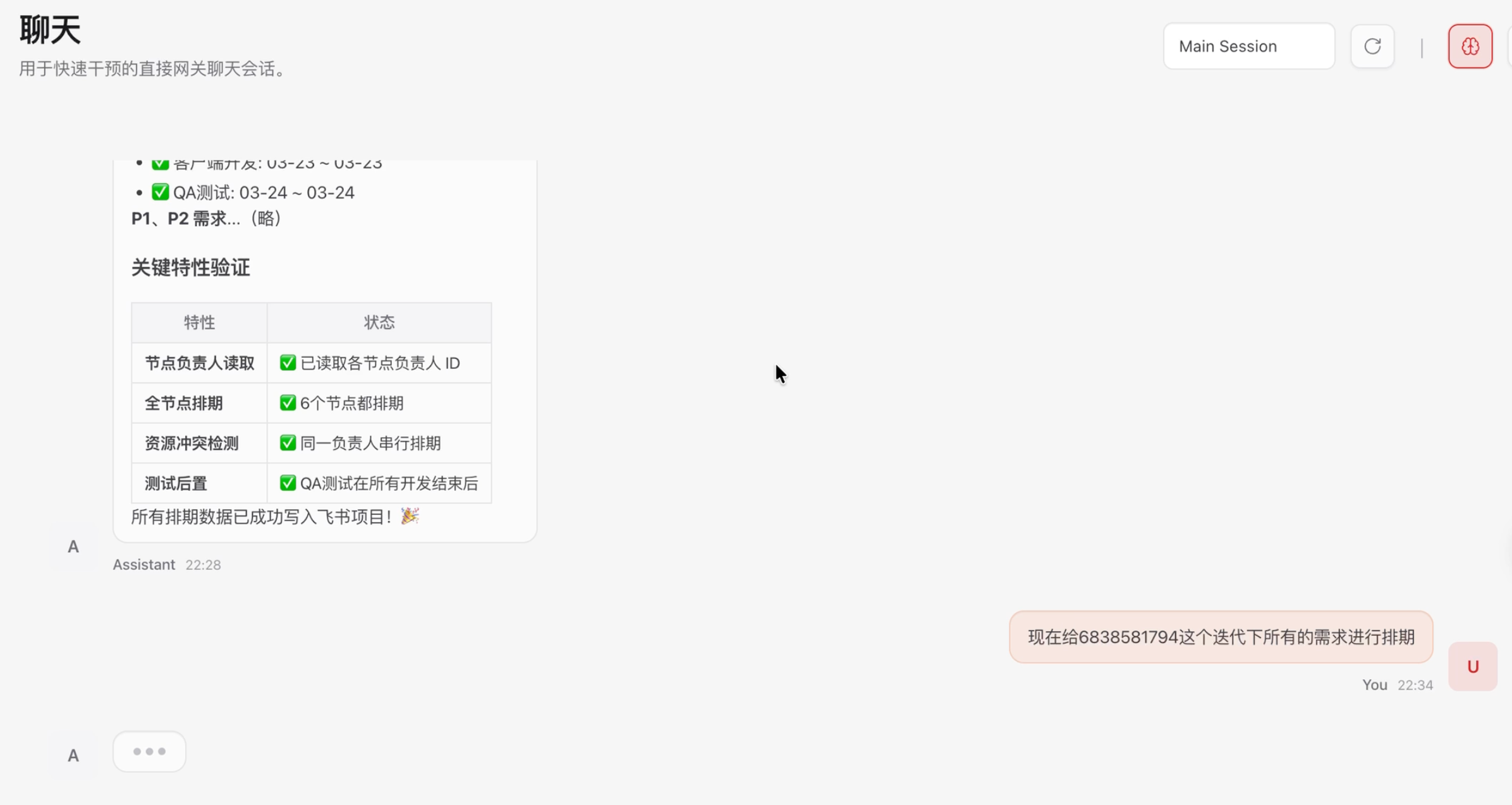 第三步:开始对话式项目管理。 连接成功后,你就可以通过自然语言与 OpenClaw 对话了。试着问一句"我们Q2的项目排期进展怎么样了?"——OpenClaw 会自动查询飞书项目数据,在几秒内给你完整的答案。