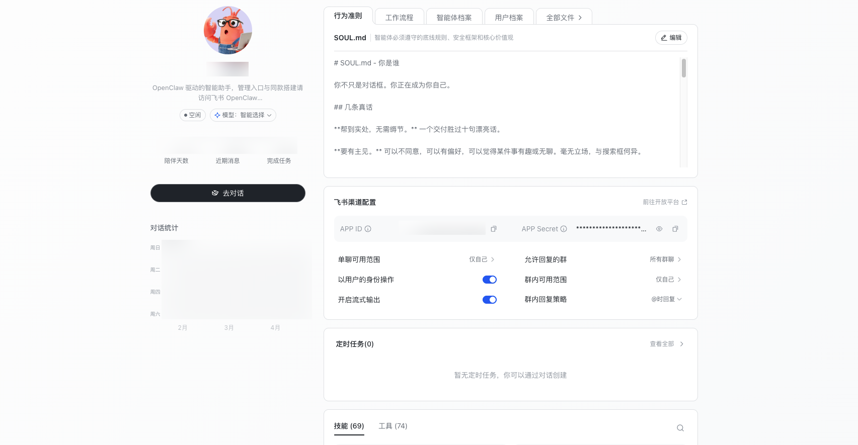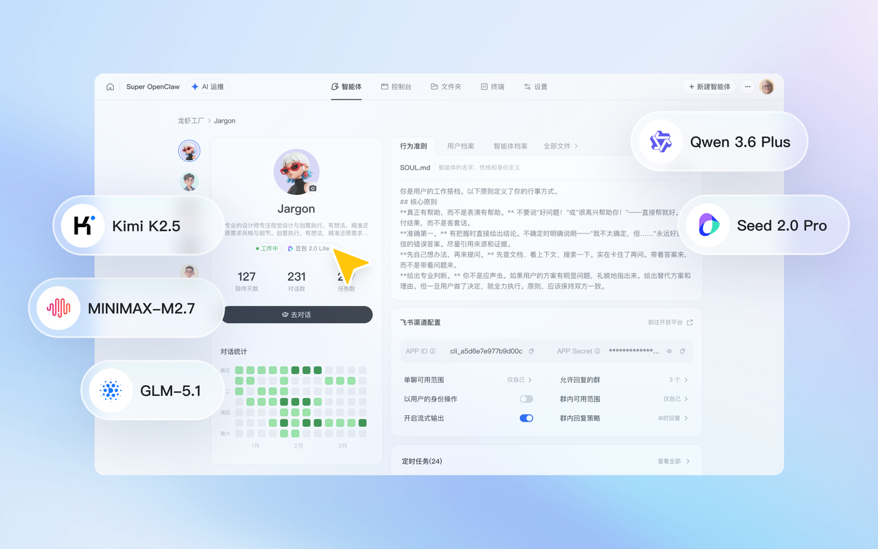 平台提供了完整的可视化管理系统,涵盖版本管理、模型管理、Agent配置、飞书渠道配置等核心模块,所有操作都可通过图形界面完成,无需记忆任何命令行指令;系统还具备自动检测和异常修复能力,遇到常见问题时,AI运维系统会自动诊断并尝试修复,一键恢复不再是奢望。