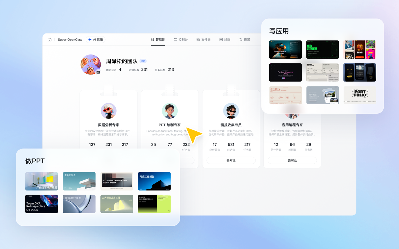 第三步:体验多智能体协作。 尝试发布一个复杂任务,如「帮我写一篇关于XX主题的2000字文章,要求包含调研数据、案例分析和建议」。观察运营主管如何拆解任务、调研专员如何搜集资料、写作专员如何产出初稿、审核专员如何把控质量——全程自动完成,你只需等待结果。