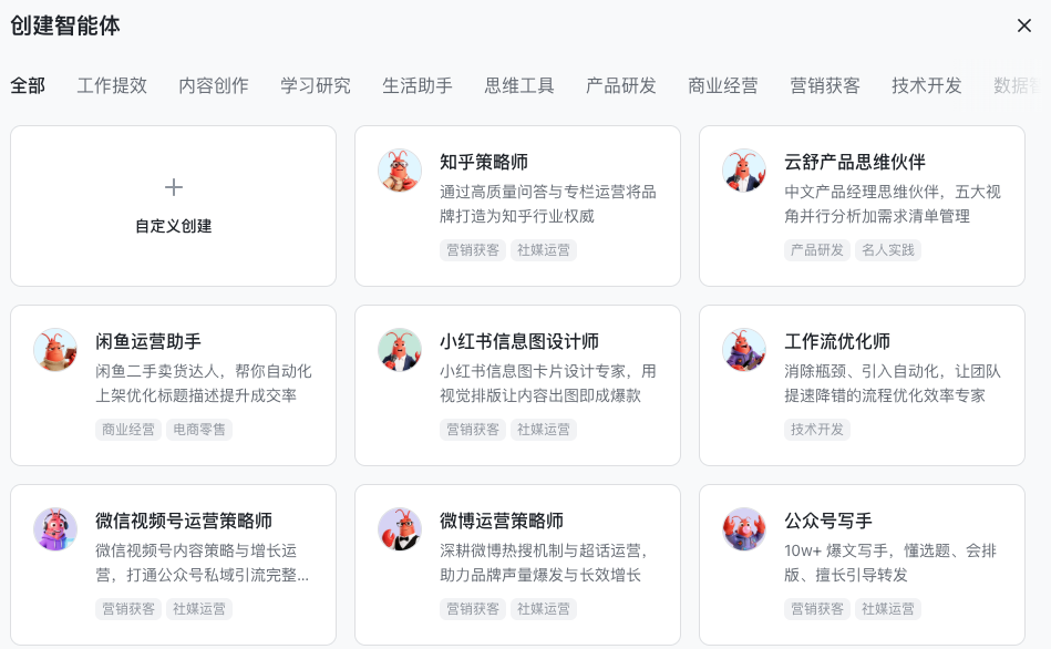 平台内置了丰富的场景化人设和技能模板,涵盖运营、客服、内容创作、数据分析等主流场景。这些模板经过精心设计,开箱即用——你不需要从零开始调试一个AI的角色设定、语气风格、专业范围,只需选择合适的模板,它就能立刻进入工作状态。