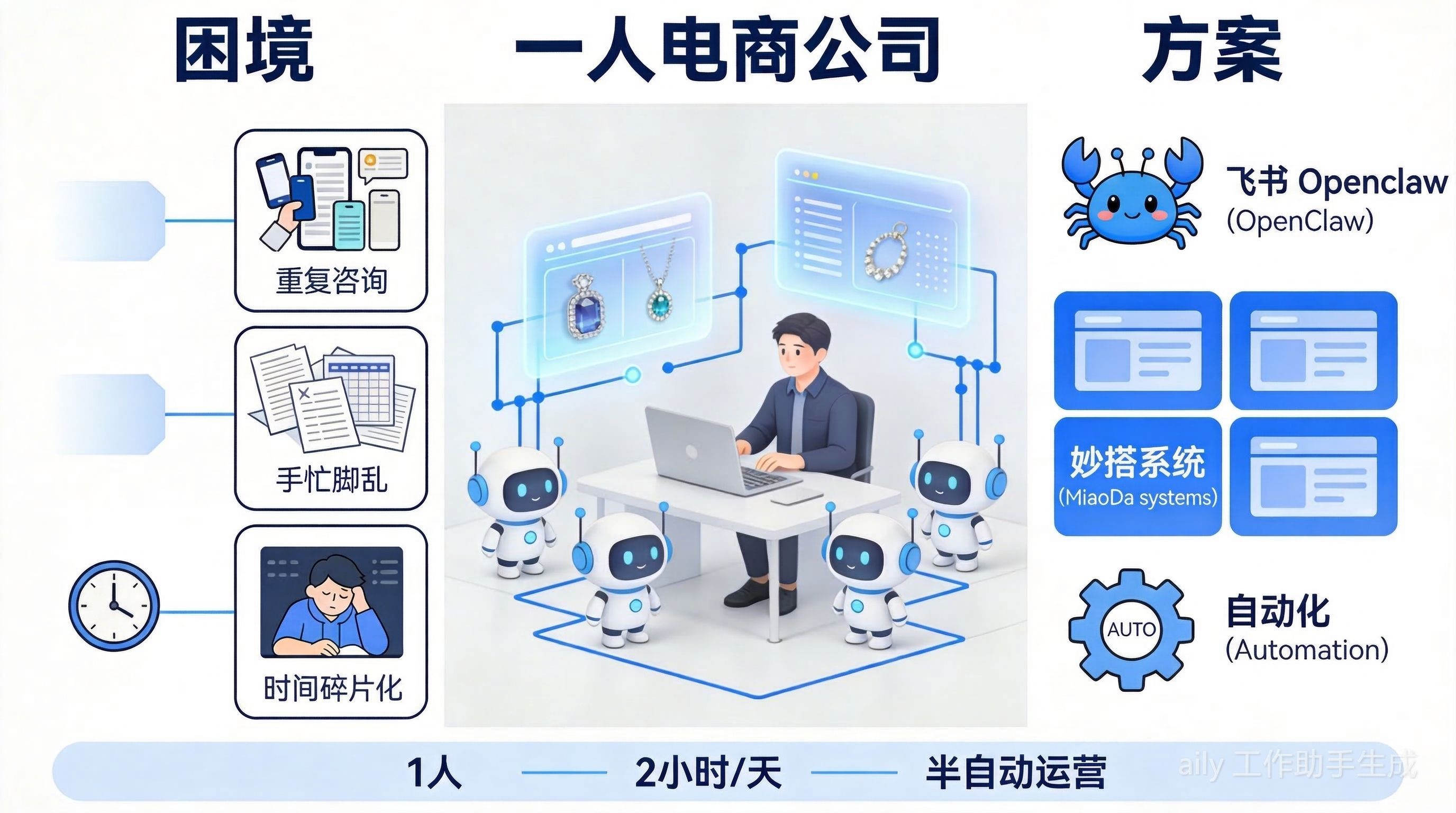 本文将讲述我如何只用飞书妙搭 和 飞书xOpenclaw ,在几乎零人力成本的情况下,开了一家属于自己的“一人饰品小店”,并实现每天两小时轻松运营的故事。