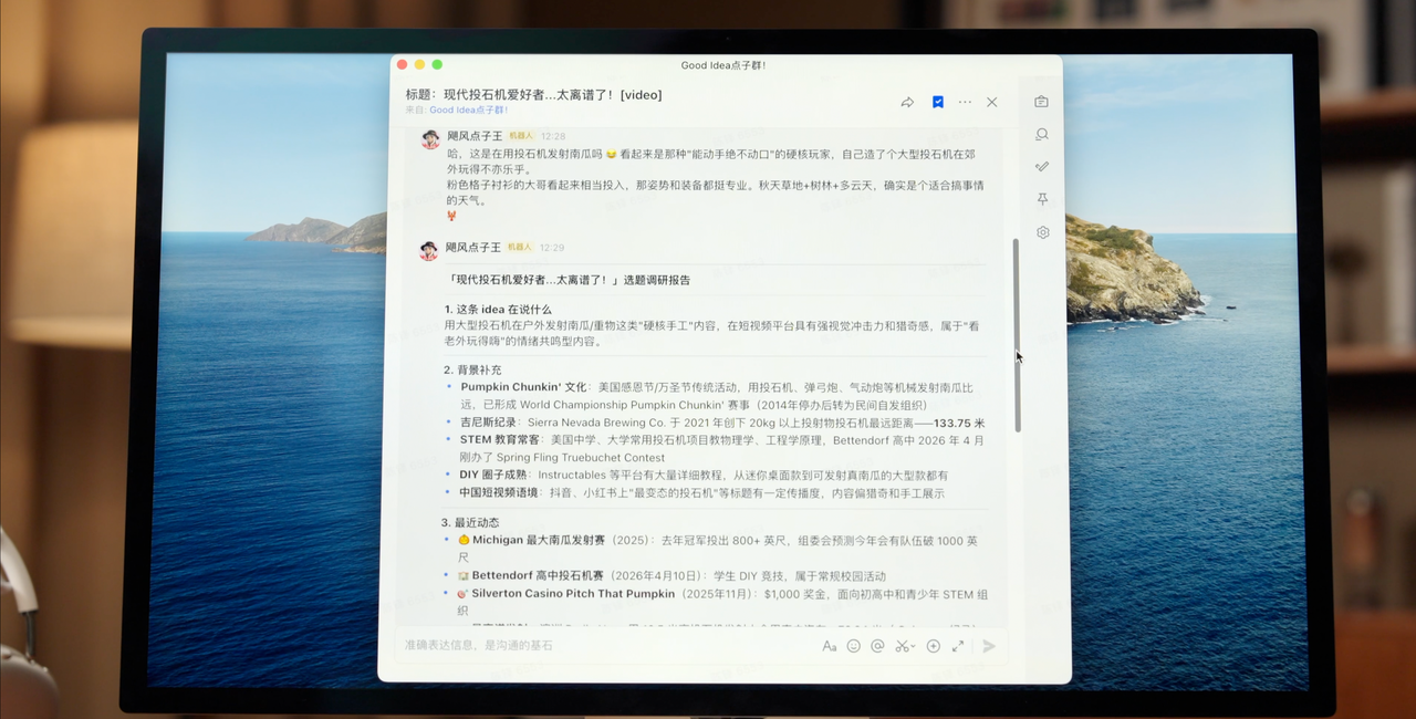 第一,智能背景补充。 当有人提出一个选题方向时,AI机器人会自动回复针对性信息,让群内其他人快速了解选题的背景和价值,大幅降低后续讨论的沟通成本。
