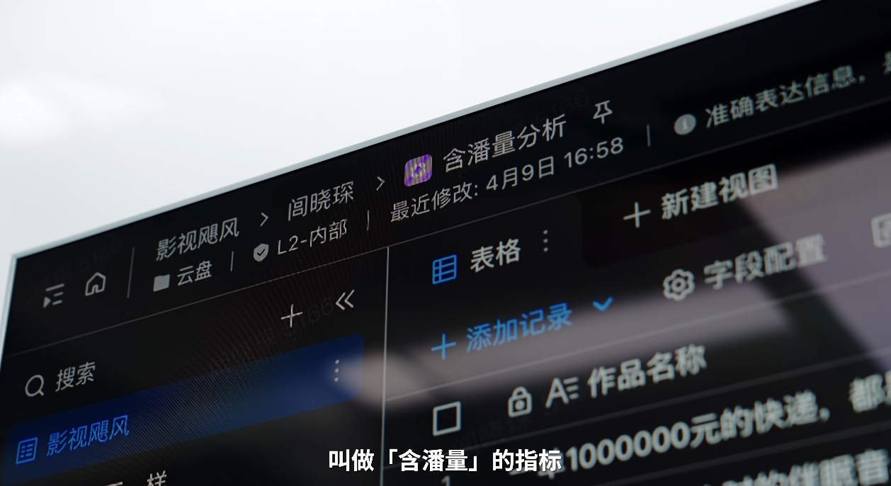 - AI数据分析与洞察产出。 影视飓风还构建了"含潘量"多维表格——用多维表格AI数据分析能力研究Tim(影视飓风主创)出镜时间与视频留存率的相关性。AI不仅能展示数据,还能进一步产出洞察报告,沿着分析路径深入挖掘,帮助团队找到内容优化的关键方向。