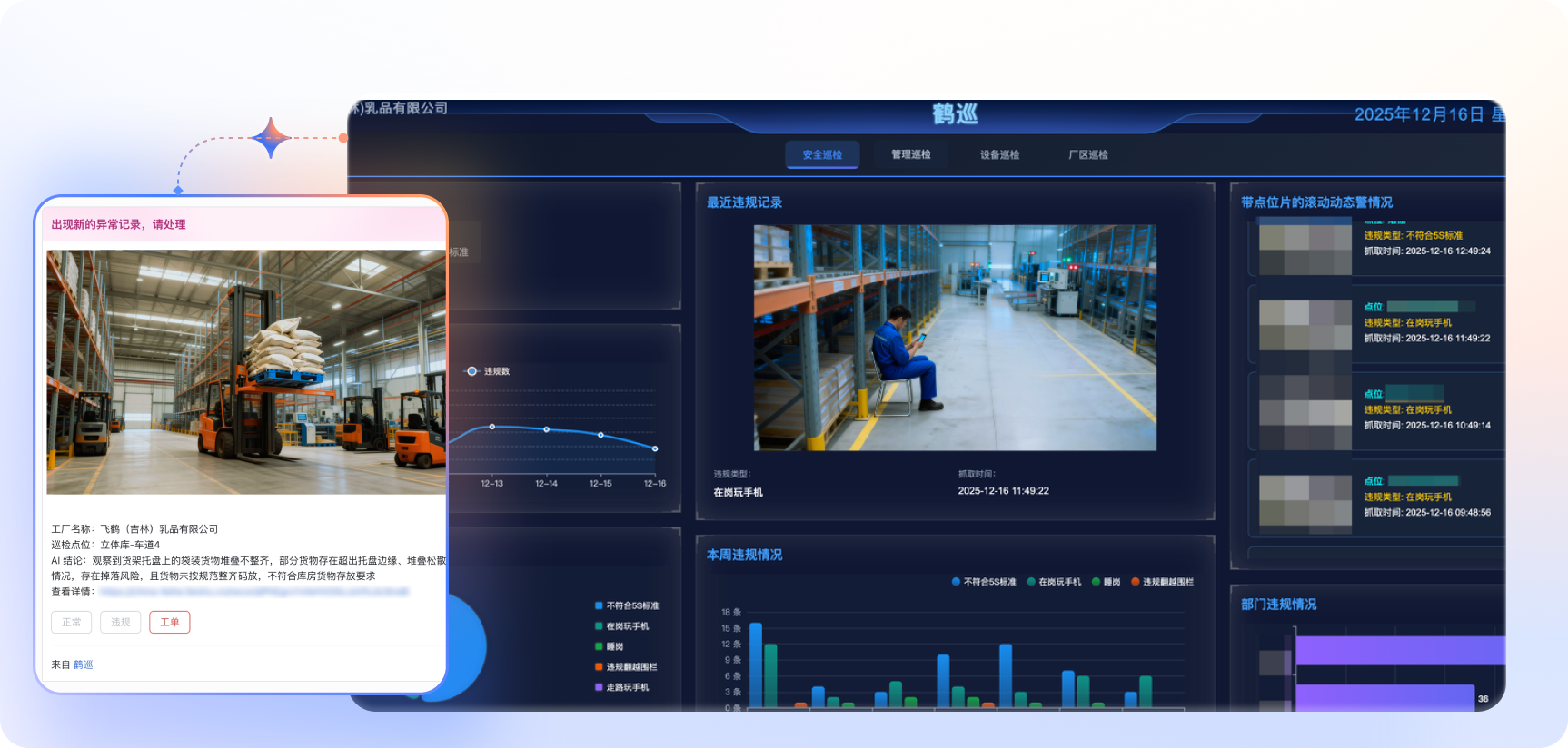 飞鹤集团生产事业部吉林工厂占地8万平方米,日处理鲜奶达 500 吨,年可生产婴幼儿配方奶粉 2 万吨,工厂的生产安全是头等大事,包括厂区的安全巡检,设备巡检等核心场景。在安全巡检场景下,人工做安全巡检有死角,且无法7x24h覆盖,几十个监控点位,一人盯屏完全盯不过来,发现问题全靠人眼识别。在设备巡检场景下,目前工厂各个设备的运行安全目前全靠人工巡检、拍照、纸质表单登记,无法核实是否按时按质完成,流程冗长且不能形成知识沉淀,数据分析也无所依凭。