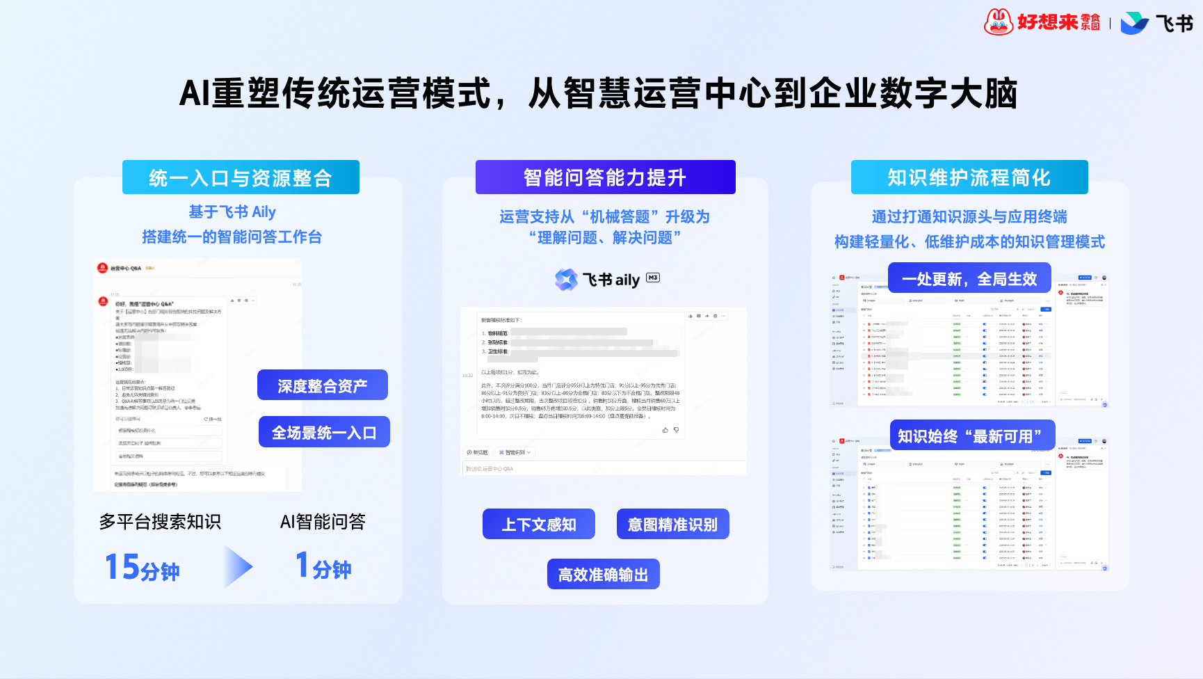 为解决以上阻碍,实现从经验驱动到数据驱动的转型突破。好想来基于飞书Aily搭建智能问答工作台,重塑运营支撑流程: